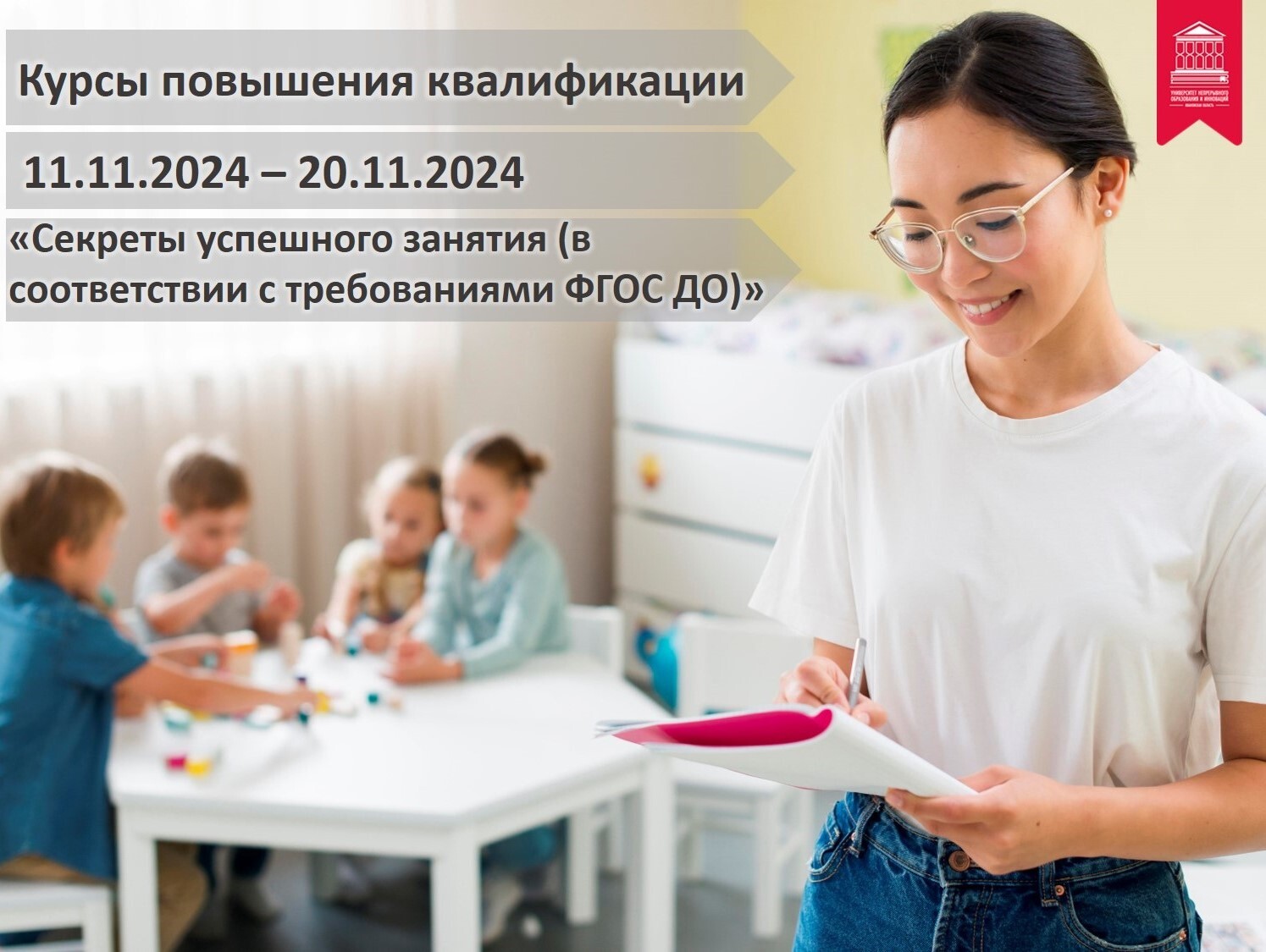 Университет непрерывного образования и инноваций начинает реализацию авторской дополнительной профессиональной программы курса повышения квалификации «Секреты успешного занятия (в соответствии с требованиями ФГОС ДО)» для воспитателей, старших воспитателей и других специалистов ДОО в объеме 24 часов.