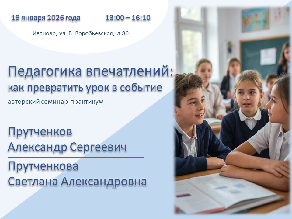 19 января 2026 года с 13:00 до 16:10 состоится авторский семинар-практикум на тему «Педагогика впечатлений: как превратить урок в событие».