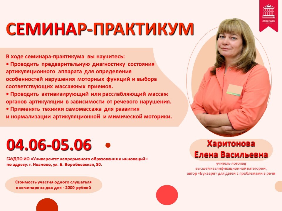 Университет непрерывного образования и инноваций приглашает учителей-логопедов, учителей-дефектологов, студентов дефектологических факультетов, специалистов, работающих в области коррекционной помощи детям с особыми потребностями, родителей на семинар-практикум «Логопедический массаж».