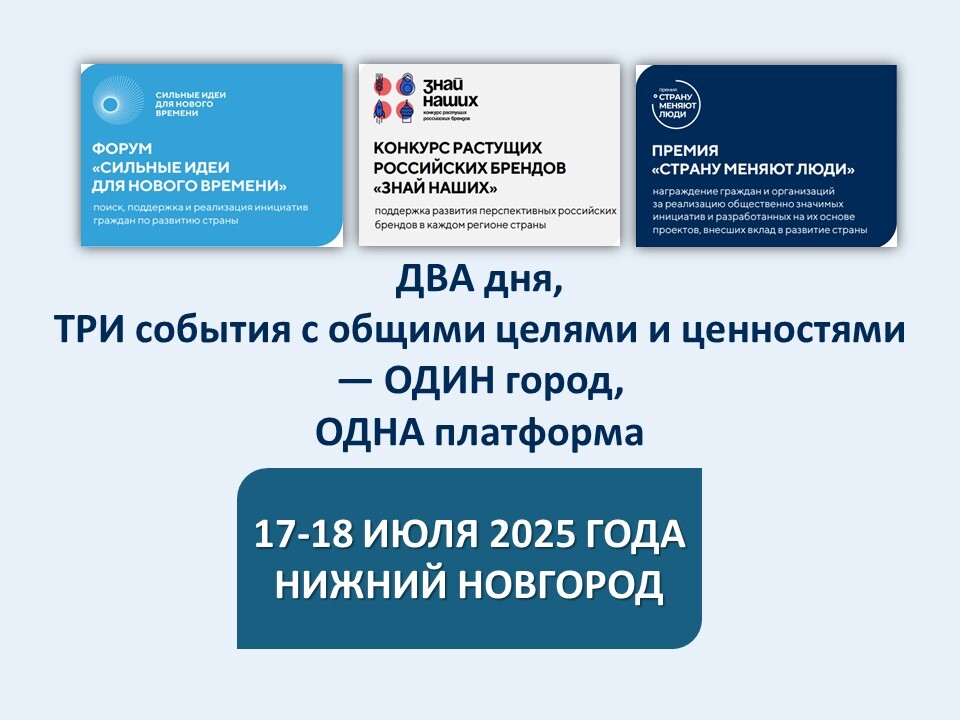 Премия «Страну меняют люди» – это ежегодная награда граждан и организаций за реализацию значимых инициатив и разработанных на их основе проектов, внесших вклад в развитие страны. Она реализуется по инициативе и поручению Президента России и впервые пройдет в рамках Форума «Сильные идеи для нового времени», который состоится в Нижнем Новгороде в июле 2025 года. Организаторы – Агентство стратегических инициатив (АСИ) и Фонд Росконгресс, при поддержке Министерства обороны РФ, соорганизаторы – ВЭБ.РФ и Правительство Нижегородской области. Партнёром премии также выступит Министерство культуры РФ.