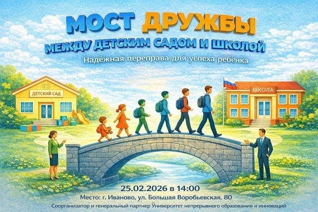 Приглашаем вас принять участие в региональной школе, которая состоится 25 февраля в городе Иваново по адресу: ул. Большая Воробьевская, д. 80. Мероприятие пройдет в формате двухдневной образовательной программы на тему: «Мост дружбы между детским садом и школой: надёжная переправа для успеха ребёнка».